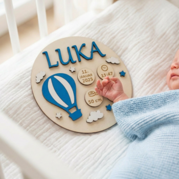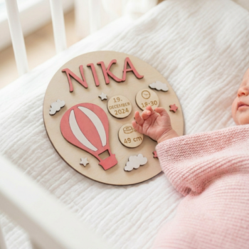 Čudovita personalizirana lesena tablica z motivom balona, ki prikazuje vse pomembne rojstne podatke vašega otroka.