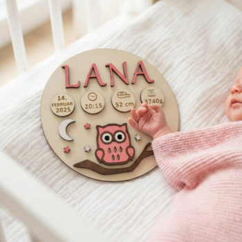 Čudovita personalizirana lesena tablica z motivom sove, ki prikazuje vse pomembne rojstne podatke vašega otroka.