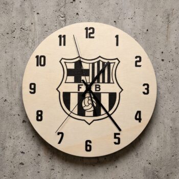 Ročno izdelana lesena stenska ura z logotipom nogometnega kluba Barcelona.