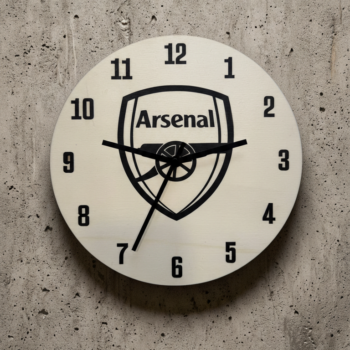 Ročno izdelana lesena stenska ura z logotipom nogometnega kluba Arsenal.