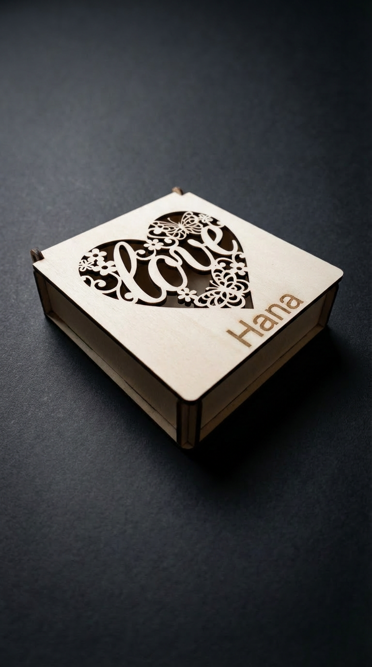 Naša personalizirana lesena škatlica je bila ustvarjena za tiste posebne ljudi v vašem življenju, ki si zaslužijo nekaj unikatnega. Nežen preplet izrezljanih metuljev in cvetja v obliki srca na pokrovu ustvarja igro svetlobe in senc, ki vas bo očarala vsakič, ko jo vzamete v roke.