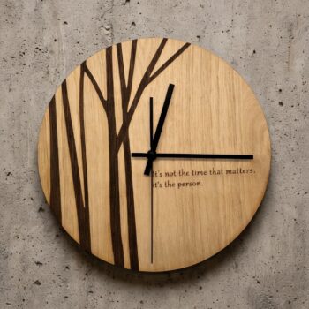 Ročno izdelana lesena stenska ura z motivom drevesa.