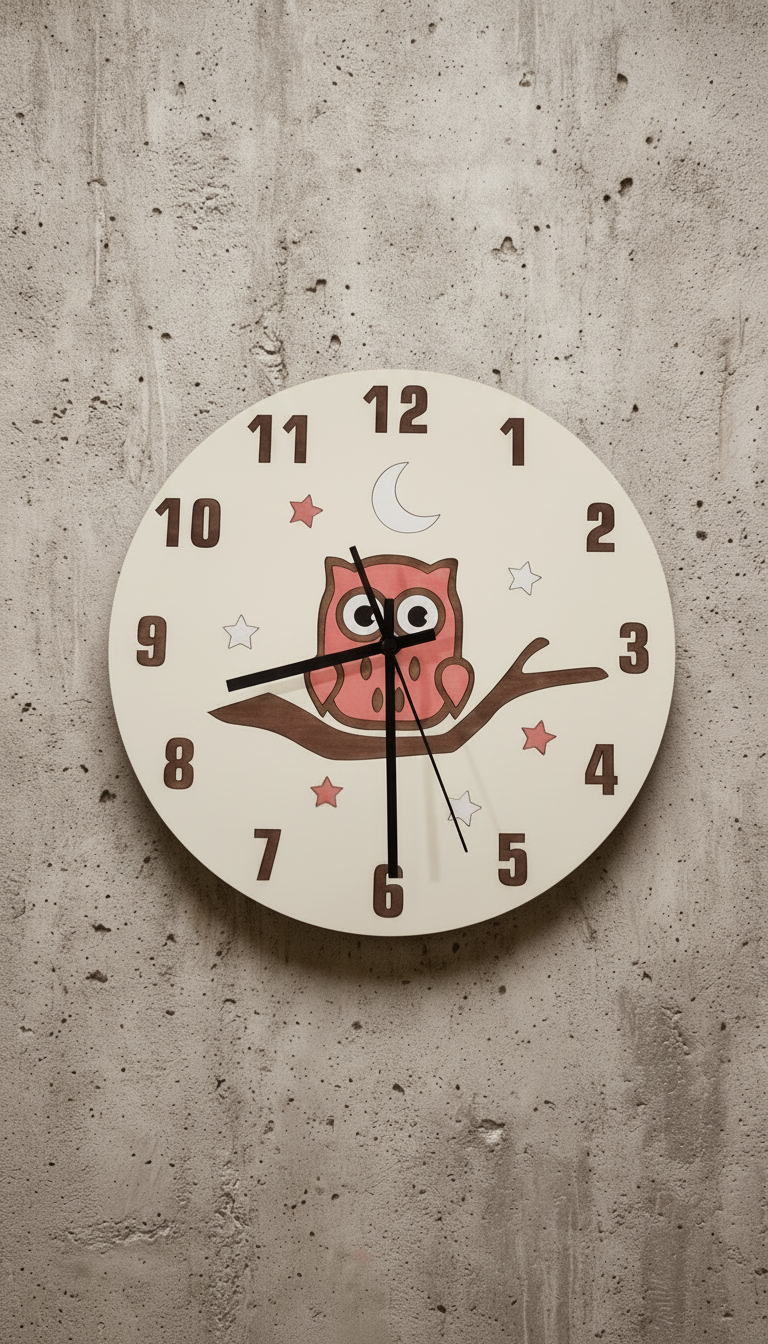 Popestrite otroško sobico z ljubko stensko uro z motivom sovice, ki bo v prostor vnesla toplino, igrivost in edinstven značaj. Ura ima nežen, minimalističen dizajn z ilustracijo rožnate sovice na veji, dopolnjeno z zvezdicami in luno, zato je idealna izbira za otroško sobo, igralnico ali kotiček, kjer želite ustvariti prijetno vzdušje.