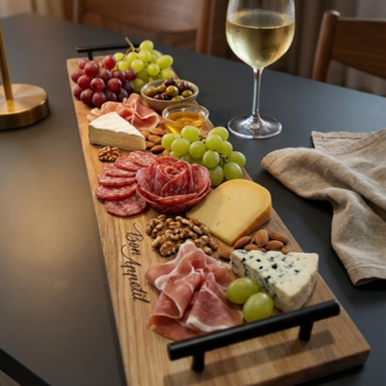 Ročno izdelana servirna deska narejena iz masivnega hrasta z gravuro “Bon Appetit”.